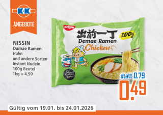 Jede Woche Spitzenpreise bei K+KNissin Damae Ramen Huhn und andere Sorten - Instant Nudeln 100g Beutel