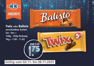 Genussmomente für zwischendurch!Ob beim Tee am Nachmittag oder zum Kaffee nach dem Essen – mit Balisto oder Twix wird jede Pause zum süßen Highlight.Knusprig, cremig und einfach unwiderstehlich – jetzt in vielen Sorten bei K+K entdecken!Balisto und Twix perfekt zum Tee oder Kaffee